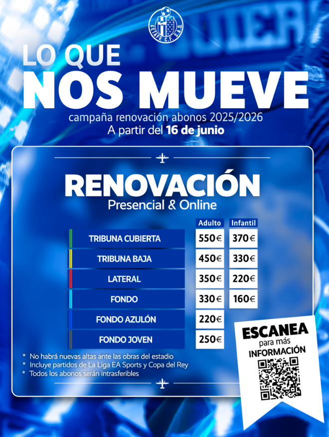 Para la temporada 2025/2026, la campaña de renovación de abonos del Getafe CF comenzó a partir del 16 de junio de 2025.